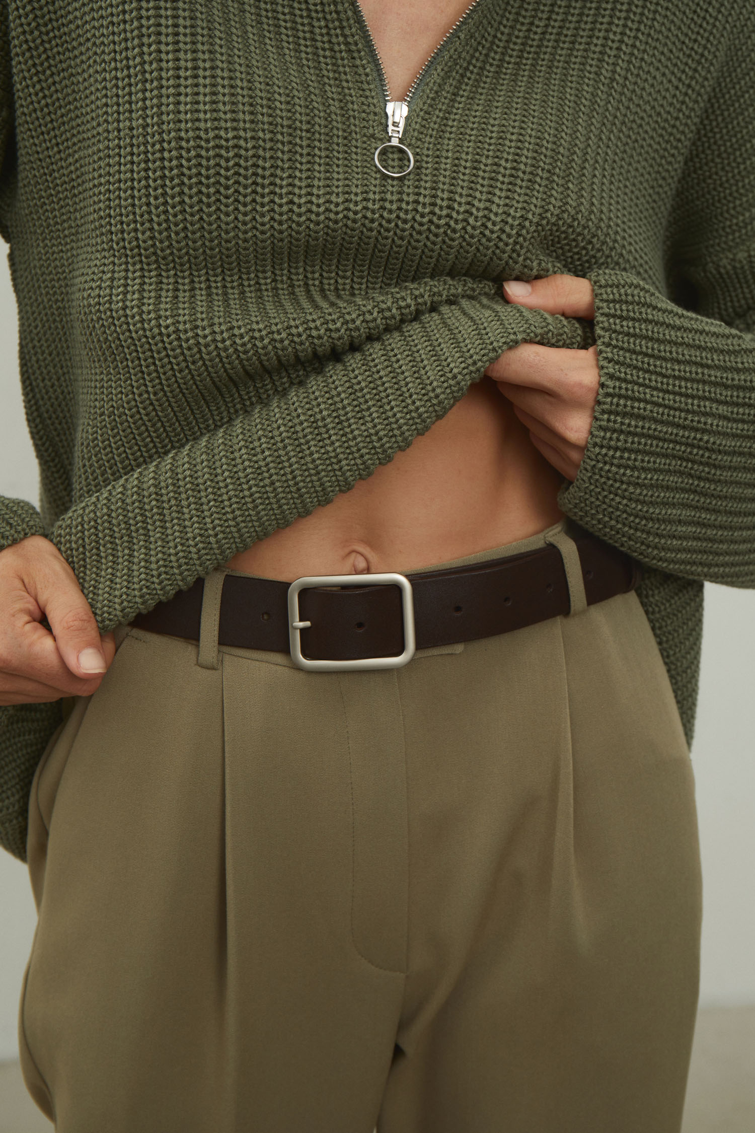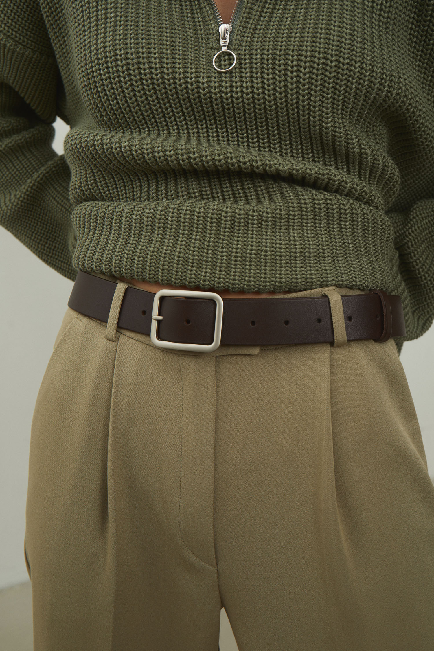 Шоколадний шкіряний ремінь із срібною пряжкою. Ширина 35 мм. Довжина розміру XS/S = 100 см. Довжина розміру M/L = 115см.